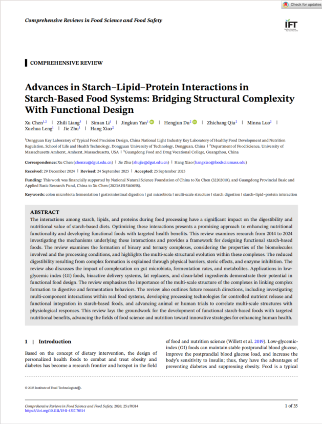 2025年11月,黄漫网站 朱杰教授团队在国际食品Top期刊《Comprehensive Reviews in Food Science and Food Safety》(Q1,IF:14.1)发表题为“Advances in Starch–Lipid–Protein Interactions in Starch-Based Food Systems: Bridging Structural Complexity With Functional Design”的封面综述文章。陈旭副教授为论文第一作者和通讯作者,朱杰教授、肖航教授为共同通讯作者。该成果为陈旭副教授在美国马萨诸塞大学阿...