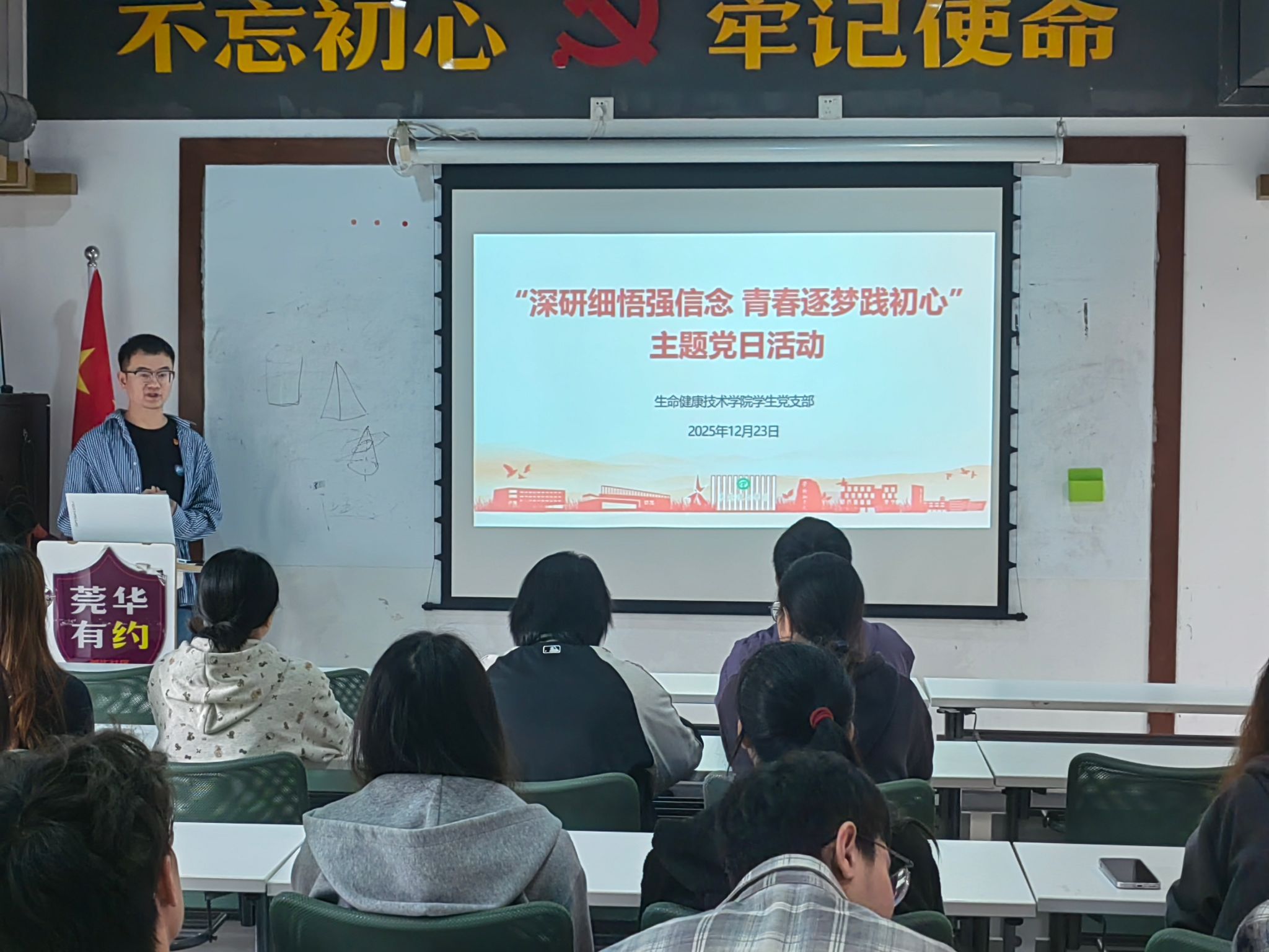 学生党支部组织全体党员于莞华社区活动室开展“深研细悟强信念 青春逐梦践初心”主题党日活动,推动党的创新理论在青年群体中落地生根、开花结果。