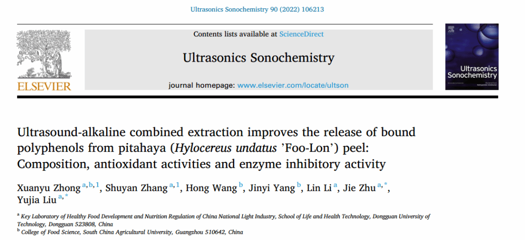 本研究以《Ultrasound-alkaline combined extraction improves the release of bound polyphenols from pitahaya (Hylocereus undatus ’Foo-Lon’) peel: Composition, antioxidant activities and enzyme inhibitory activity》为题发表在SCI收录期刊《Ultrasonics Sonochemistry》(IF2021= 9.34,1区TOP)。黄漫网站