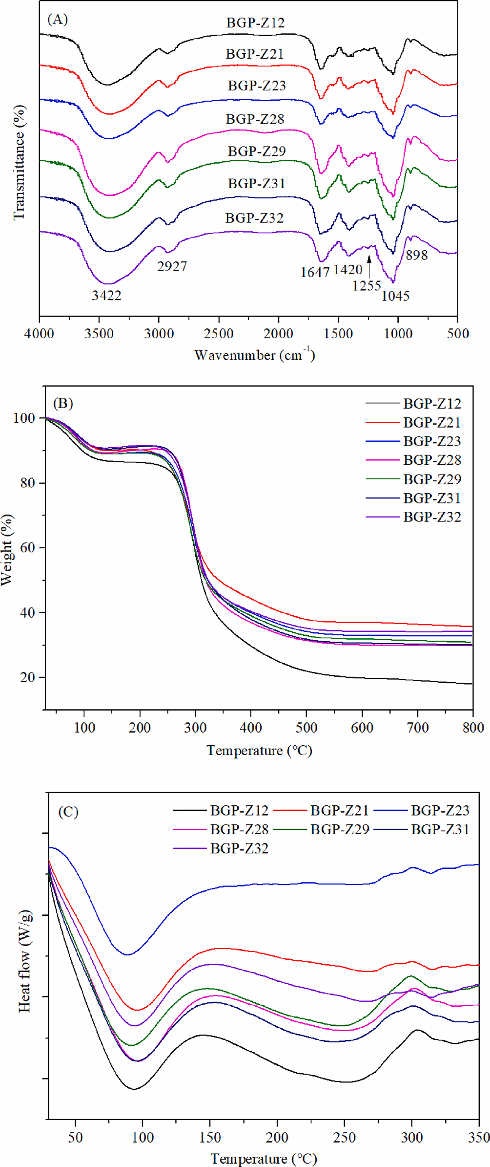 图1 不同生长阶段大麦苗多糖的FT-IR光谱(A)、TGA谱图(B)和DSC热图(C)