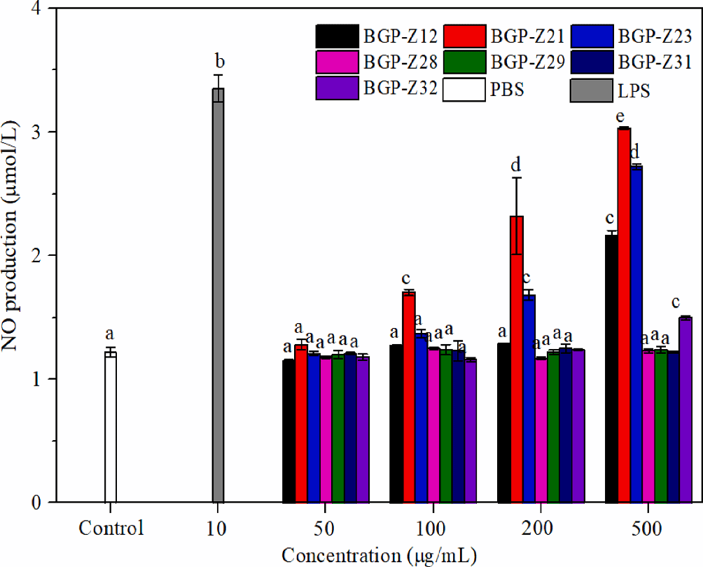 图3 不同生长阶段大麦苗多糖对巨噬细胞RAW264.7一氧化氮生成的影响