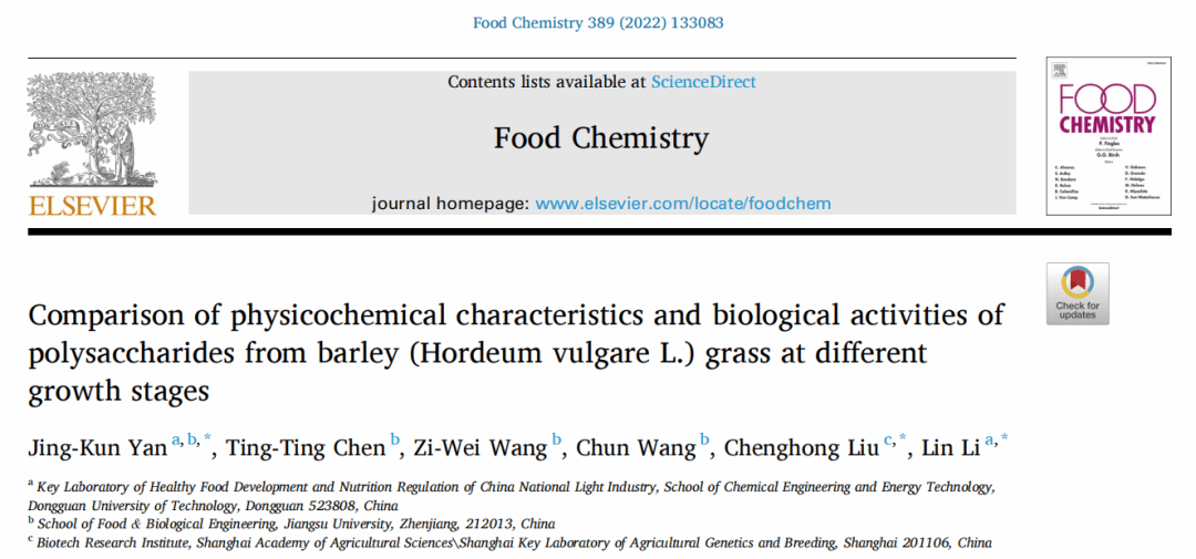食品营养健康工程与智能化加工研究中心闫景坤教授(第一作者)在国际食品顶级期刊《Food Chemistry》(IF: 9.231, Q1)发表了题为“Comparison of physicochemical characteristics and biological activities of polysaccharides from barley (Hordeum vulgare L.) grass at different growth stages”的研究论文。