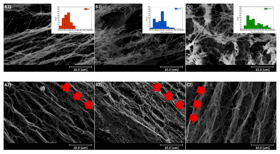 本研究旨在探究两种半纤维素(阿拉伯木聚糖(AX)、β-葡聚糖(MLG))对天然细菌纤维素各向异性力学特性的影响。研究借鉴了M.J. Gidley等建立的细菌纤维素-植物细胞壁多糖复合体系,构建了BC-AX与BC-MLG两种凝胶,比较了其与天然细菌纤维素凝胶在结构及力学性质上的各向异性程度。
