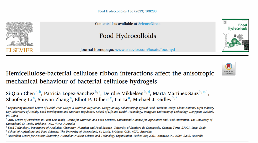 食品营养健康工程与智能化加工研究中心陈思谦(第一作者)在国际食品顶级期刊《Food Hydrocolloids》(IF: 11.504, Q1)发表了题为“Hemicellulose-bacterial cellulose ribbon interactions affect the anisotropic mechanical behaviour of bacterial cellulose hydrogels”的研究论文。