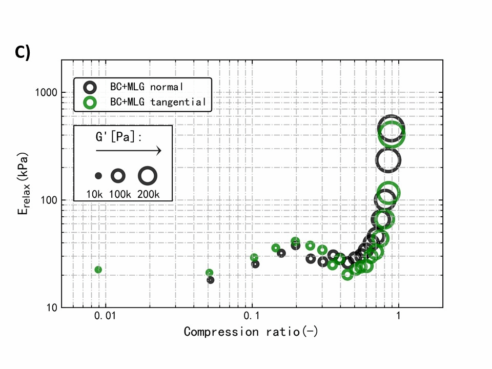研究发现,AX和MLG虽无法对细菌纤维素的结晶结构有显著影响,但可以球状团聚物的形式吸附在纤维表层。而通过两个方向上的力学及流变学测试发现,两种半纤维素在小应变(线性黏弹区,小振幅振荡剪切实验)对细菌纤维素水凝胶的各向异性力学性能影响较小,而在大应变(非线性黏弹区,压缩-应力松弛实验)条件下能减少细菌纤维素水凝胶力学性能的各向异性程度。本研究介绍了一种简单、绿色的方法调控细菌纤维素凝胶的各向异性力学性能,为进一步开发细菌纤维素的利用价值提供了经验。