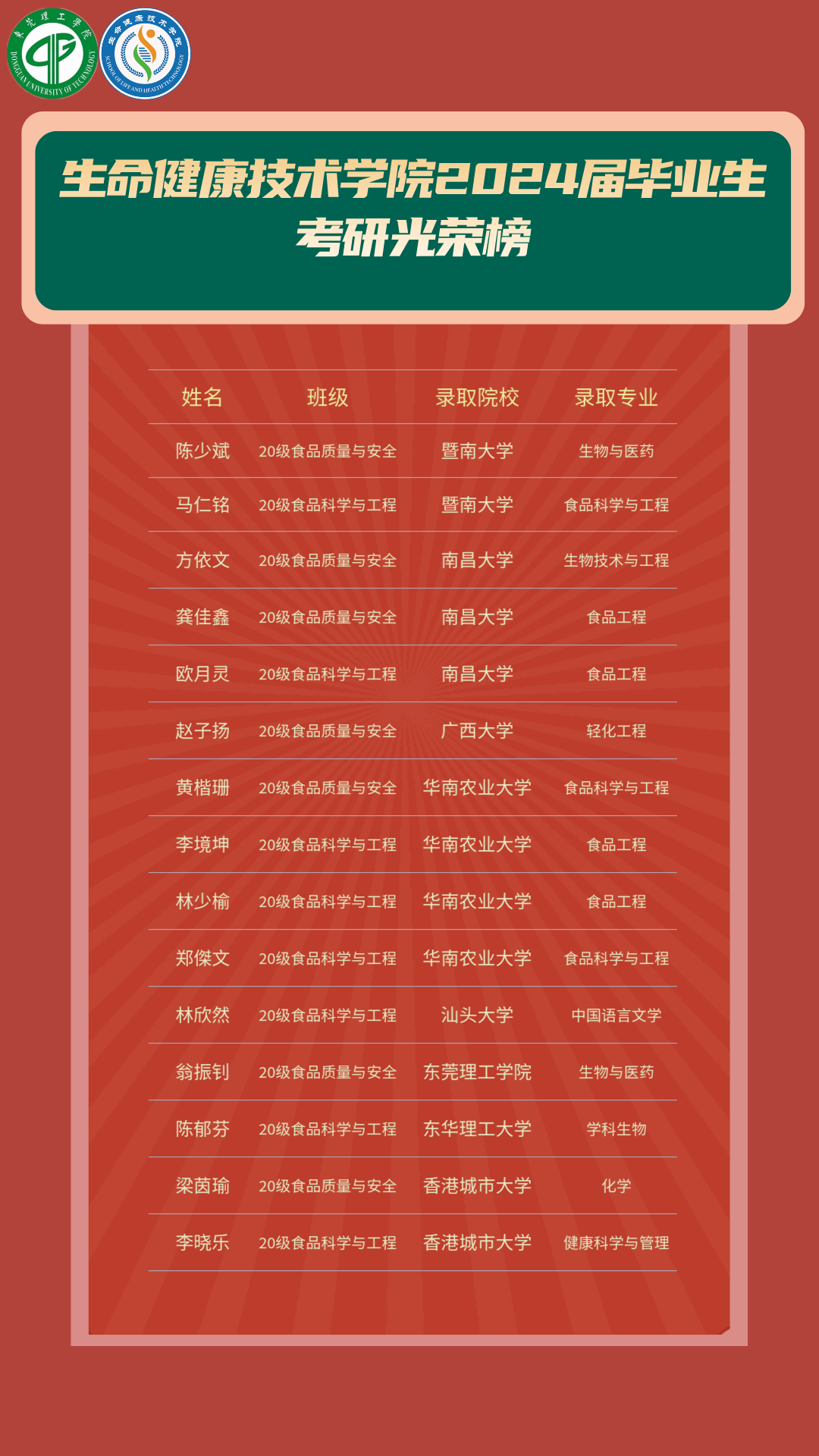2024届毕业生考研升学捷报频传,15名同学通过努力实现了一战成“硕”的梦想,其中,有多名同学被暨南大学、南昌大学、华南农业大学等高水平大学录取。据统计,学院2024届毕业生升学率达23.44%。