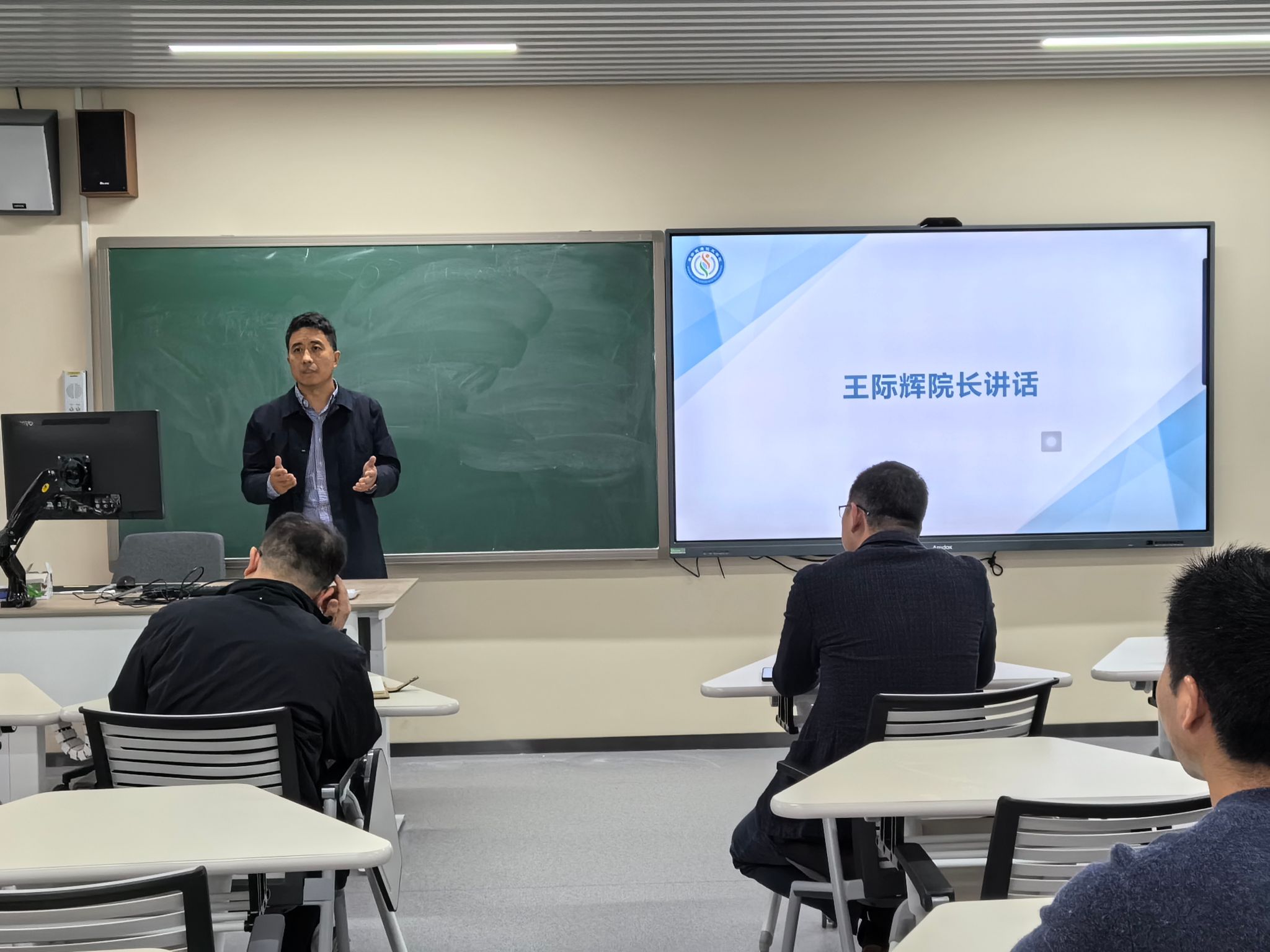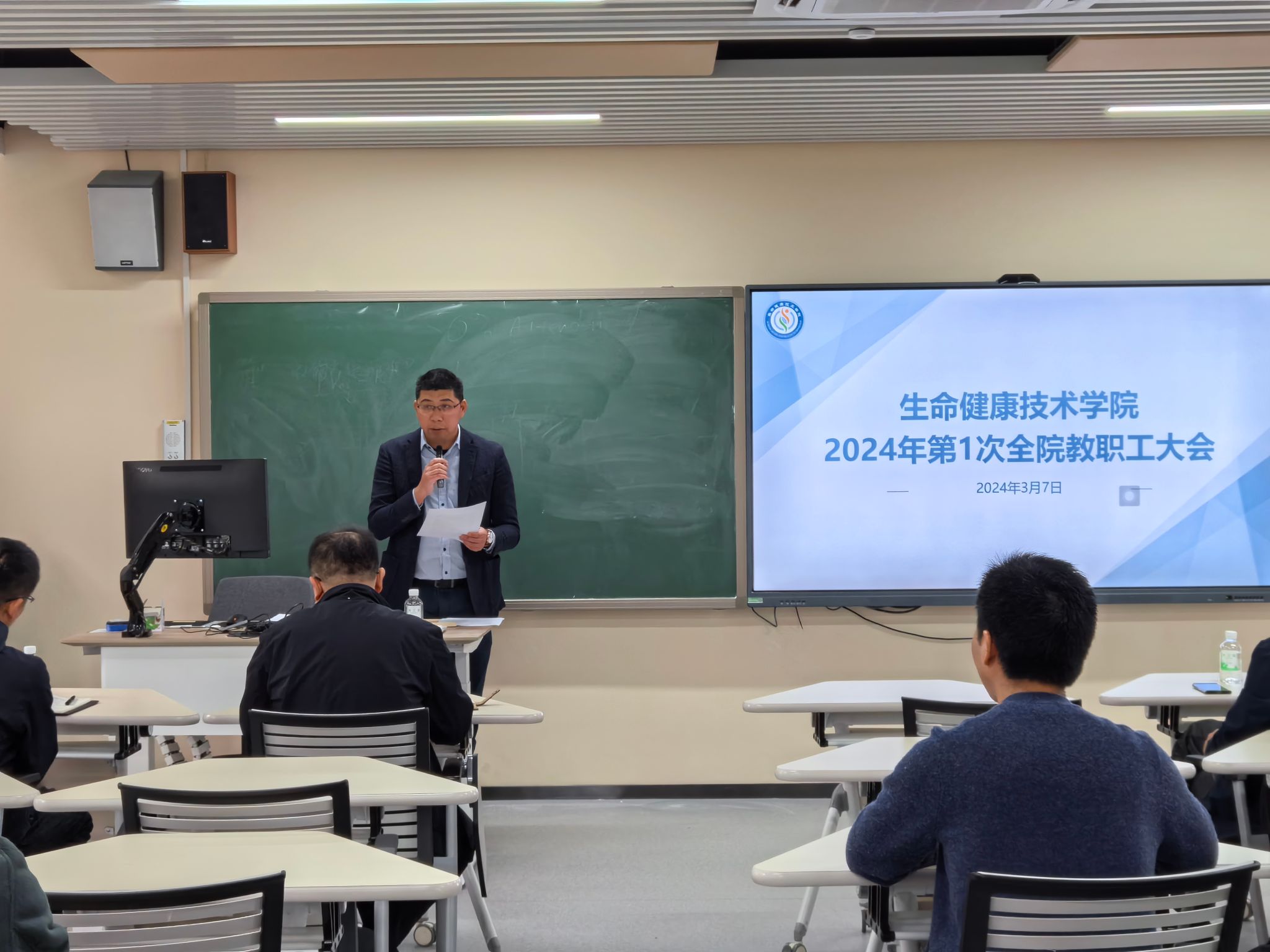 在教学楼6C-301召开2024年第1次全院教职工大会,会议由学院党委书记谢炯标主持,学院全体教职工参加会议。
