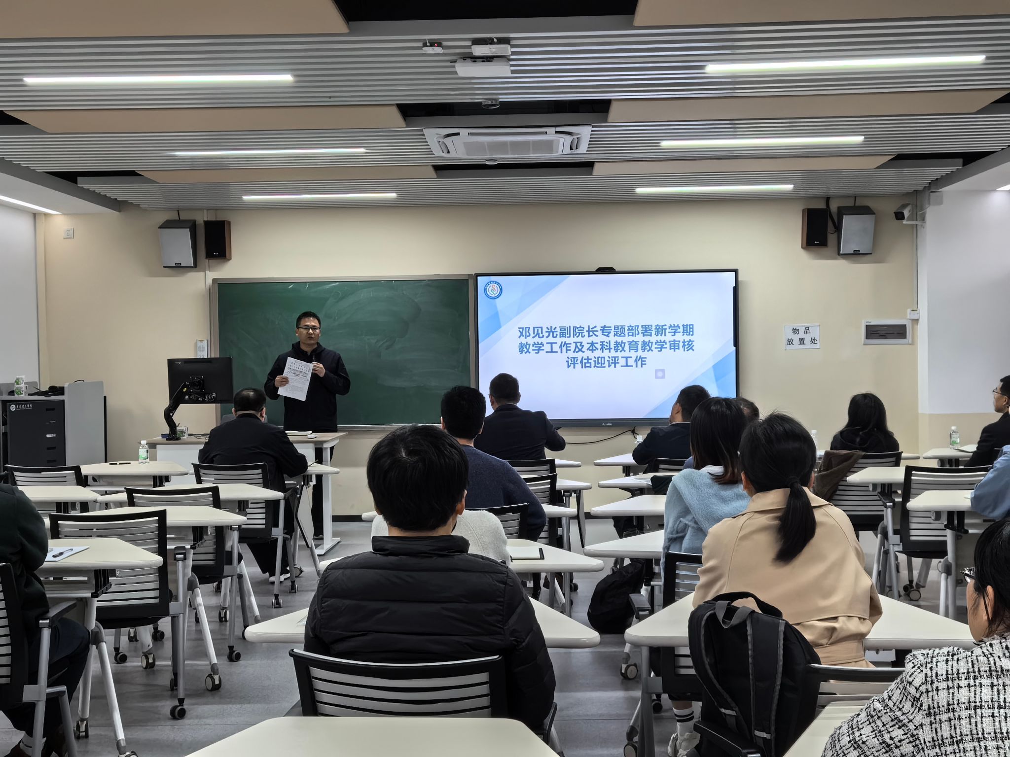 随后,邓见光副院长对新学期教学工作及本科教育教学审核评估迎评工作进行专题部署。他指出,本科教育教学审核评估工作是学校当前的头等大事,学院应切实履行主体责任,全面落实本科教学管理相关文件,深入开展课堂教学规范和纪律教育以及常态化教风学风督导检查,多措并举推进教风学风一体化建设。全体教职工应牢固树立“全员评建”主体意识和责任意识,主动引导学生遵守课堂纪律,积极落实“课程思政”教育理念,不断改善教学方式,加强师生互动,充分调动学生的学习积极性和主动性,提高课堂参与度,进一步提高本科生教育教学质量。