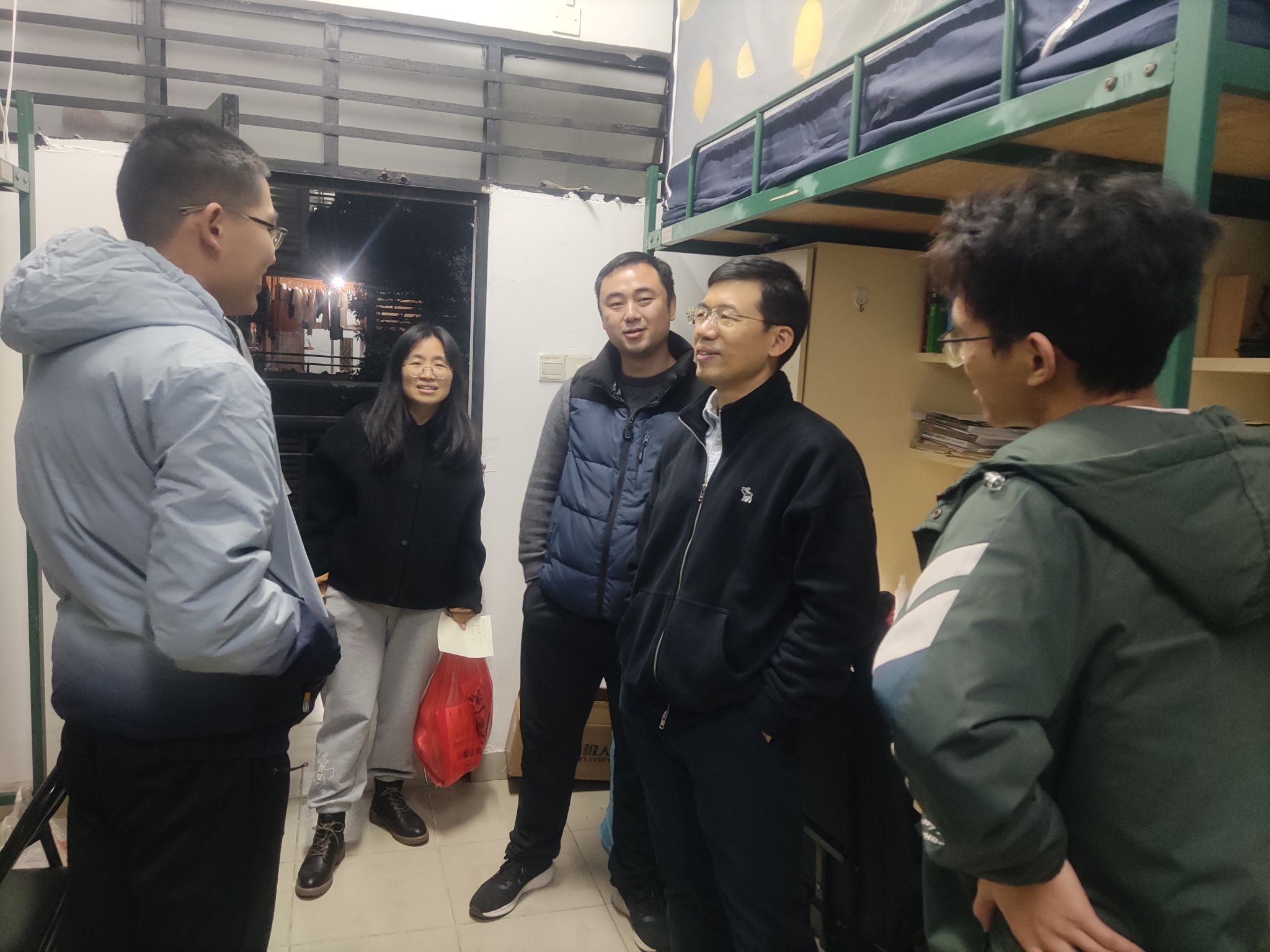 考研学子交流备考情况,并给予同学们三点建议:一要树立自信心,调节好身心状态,沉着应战;二要把握好最后几天的学习节奏,巩固复习成果,查缺补漏;三要及时关注考研相关信息,全方位做足考试准备,从容应考。葛金虎表示学院会为考研的同学提供全力支持,助力同学们考试成功。随后,老师们为学生送上精心准备的“考试加油包”,祝愿考研学子考试顺利。活动结束后,老师们走访毕业班宿舍,深入了解毕业生毕业设计、实习实践、就业等情况。