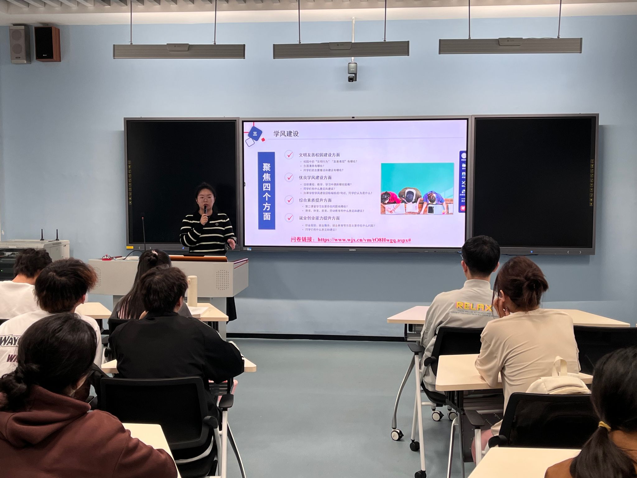 于6A301召开学风建设座谈会。座谈会由学院党委副书记葛金虎主持,全体班主任、辅导员参加。辅导员杨梅青组织学生干部和各年级学生代表于6B202开展交流座谈。