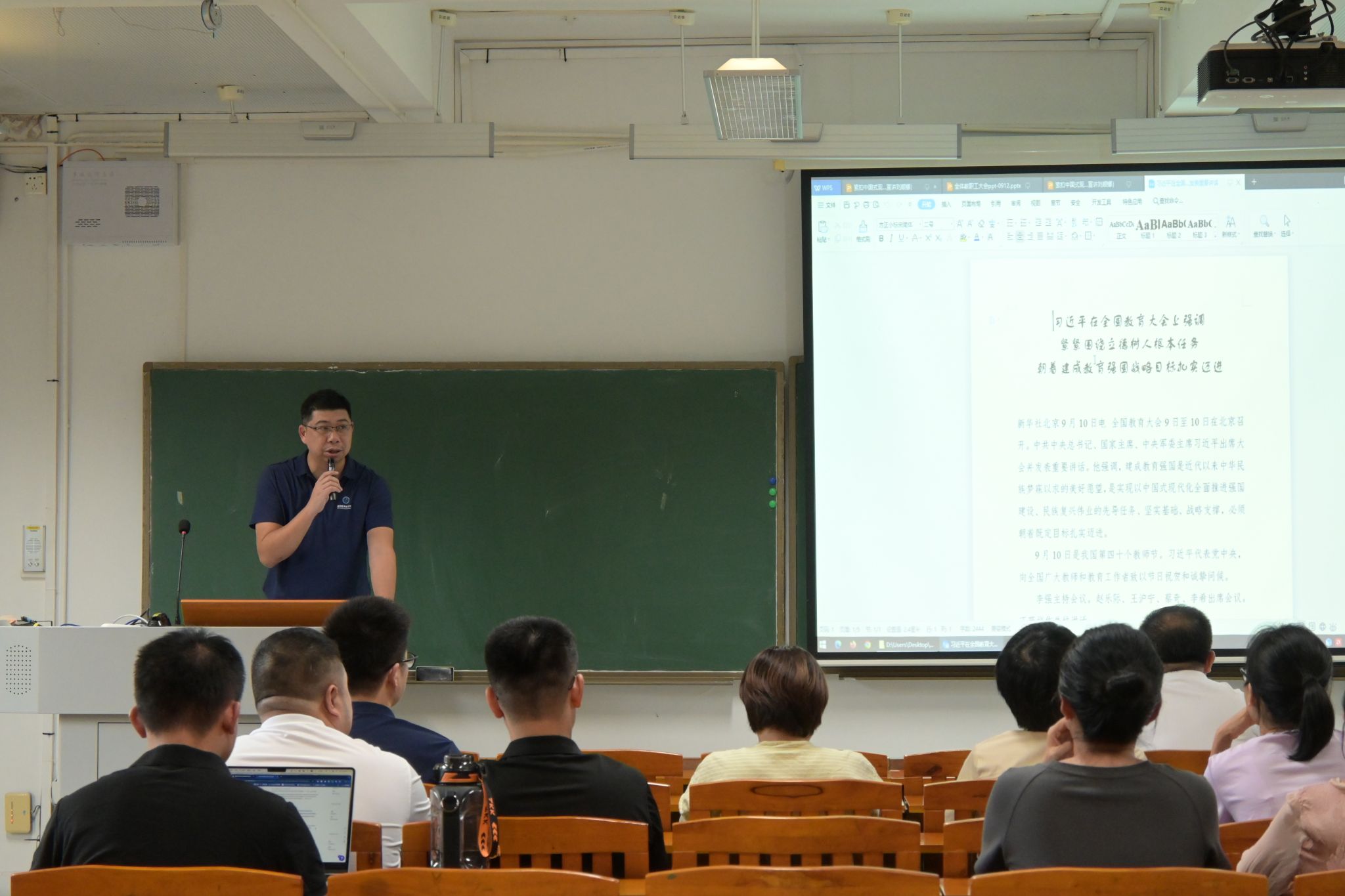 会上,学院党委书记谢炯标首先带领全体教职工共同学习了习近平总书记在全国教育大会上的重要讲话精神,并强调了师德师风建设在教育工作中的重要性。他指出,全院教职工应大力弘扬教育家精神,牢记为党育人、为国育才的初心使命,紧紧围绕立德树人根本任务,落实好师德师风第一标准,争做“四有”好老师,努力成为“大先生”,以身作则树立良好师德形象,始终坚持用党的创新理论铸魂育人。他要求,全院教职工主动关注学生学习生活,加强师生互动,及时了解学生的需求和困难,从而提供更有针对性的帮助和支持,为培养高素质应用型创新人才作出更大贡献。