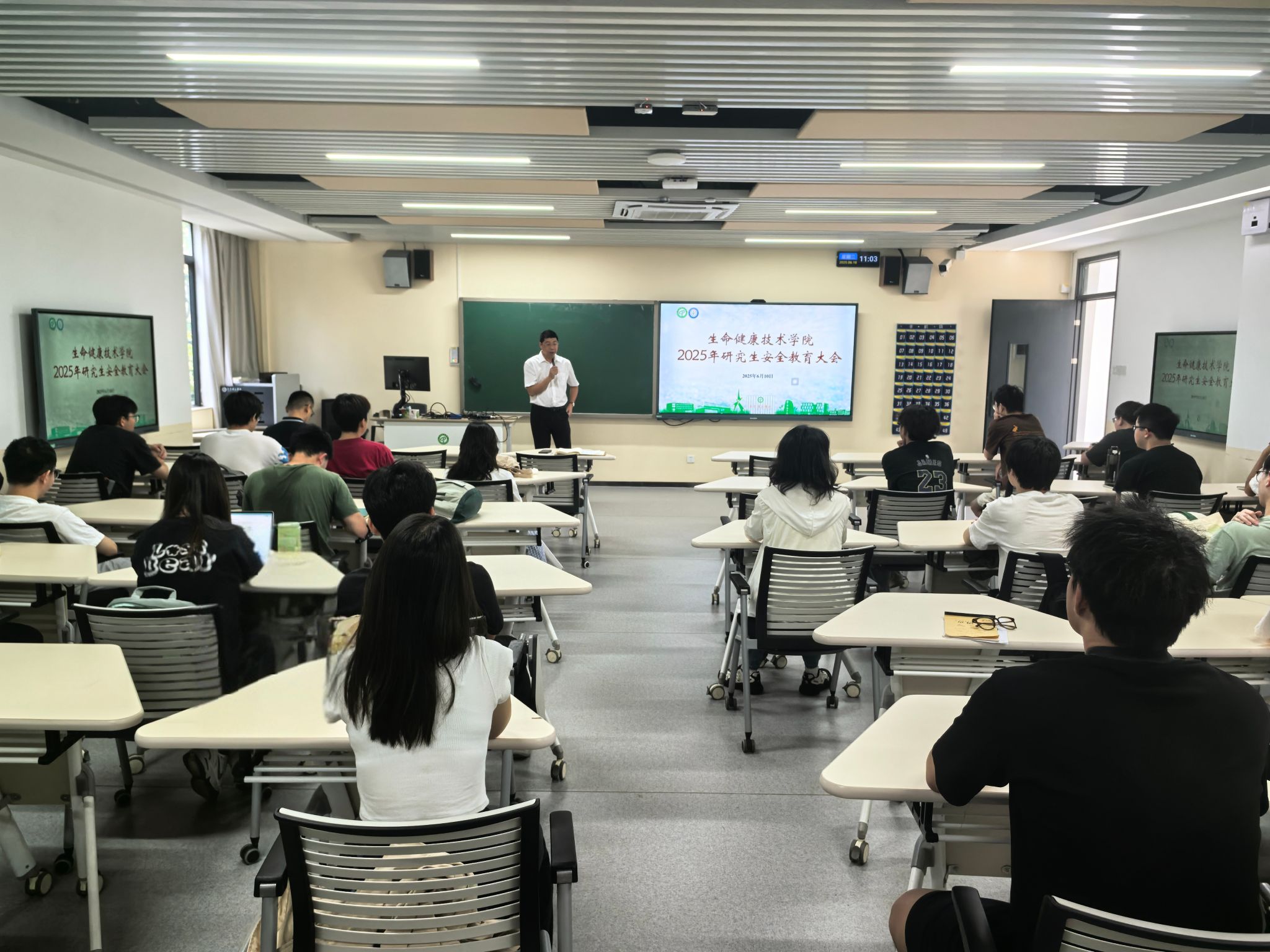 在6C202课室召开2025年研究生安全教育大会。学院党委书记谢炯标,副院长邓见光,研究生辅导员刘文渊以及全体在校研究生参加会议。