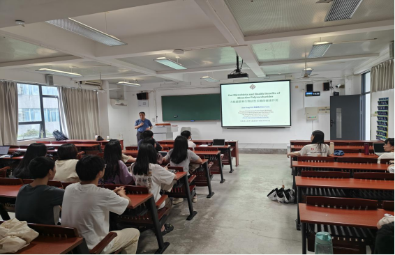 开放课堂上,吴建勇教授以其深厚的学术造诣和丰富的教学经验,向大家详细介绍了蛋白质糖基化所具有的生物学功能及其与营养和健康的关系、糖链结构与功能的功效关系、糖酶生物工程及功能糖基生物质的生物合成等内容。吴教授的讲解详尽而富有启发性,使得大家对膳食营养与健康领域的理解更加深刻,且课程以全英文进行,在拓宽学生学术视野的同时,也为他们提供了学习专业英语的机会。